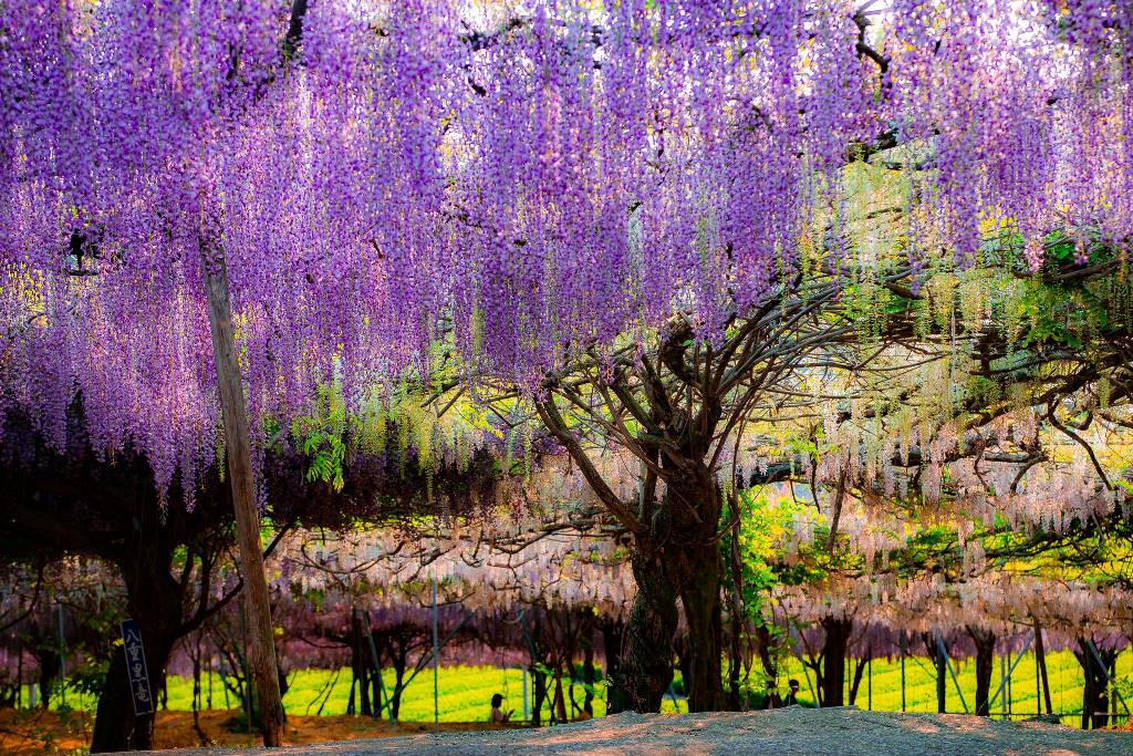 2400坪の藤棚に250本のフジが広がり、美しい花姿を見に遠方から訪れる人も多い、宇佐市の春の人気スポットです。白、ピンク、紫など見事なフジの花と甘い香り、新緑の茶園と新茶を煎じる香ばしい香りは初夏への移ろいを楽しませてくれます。